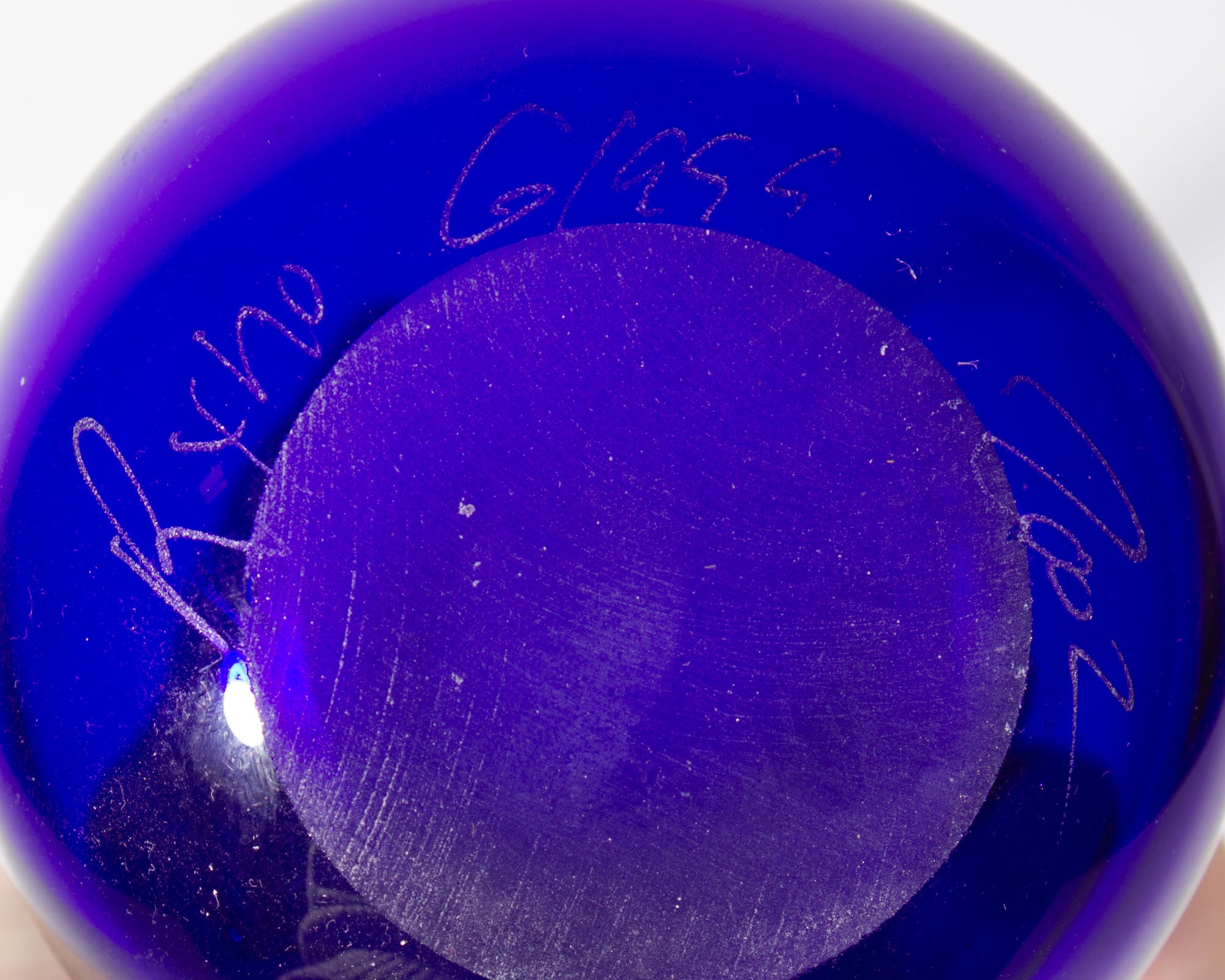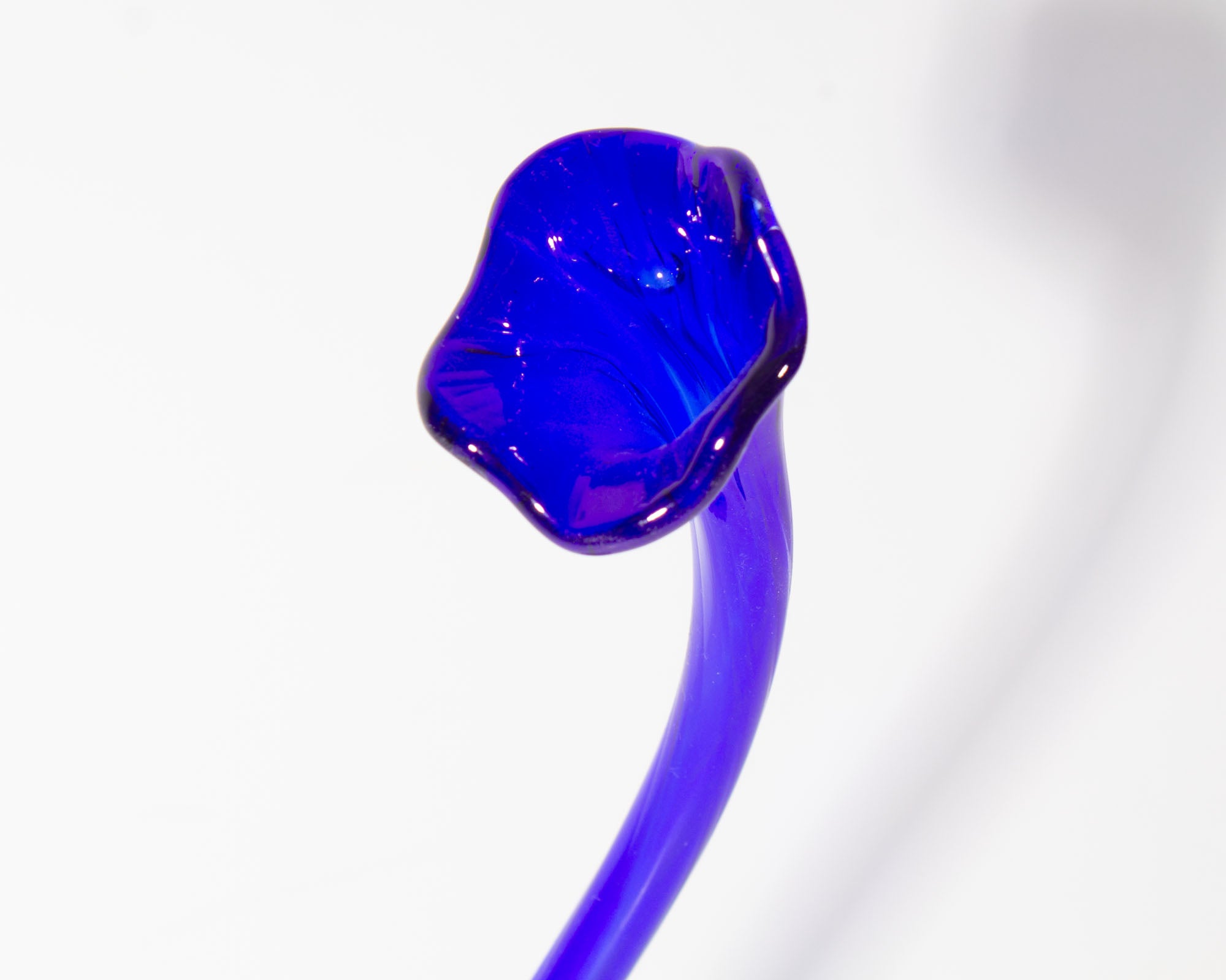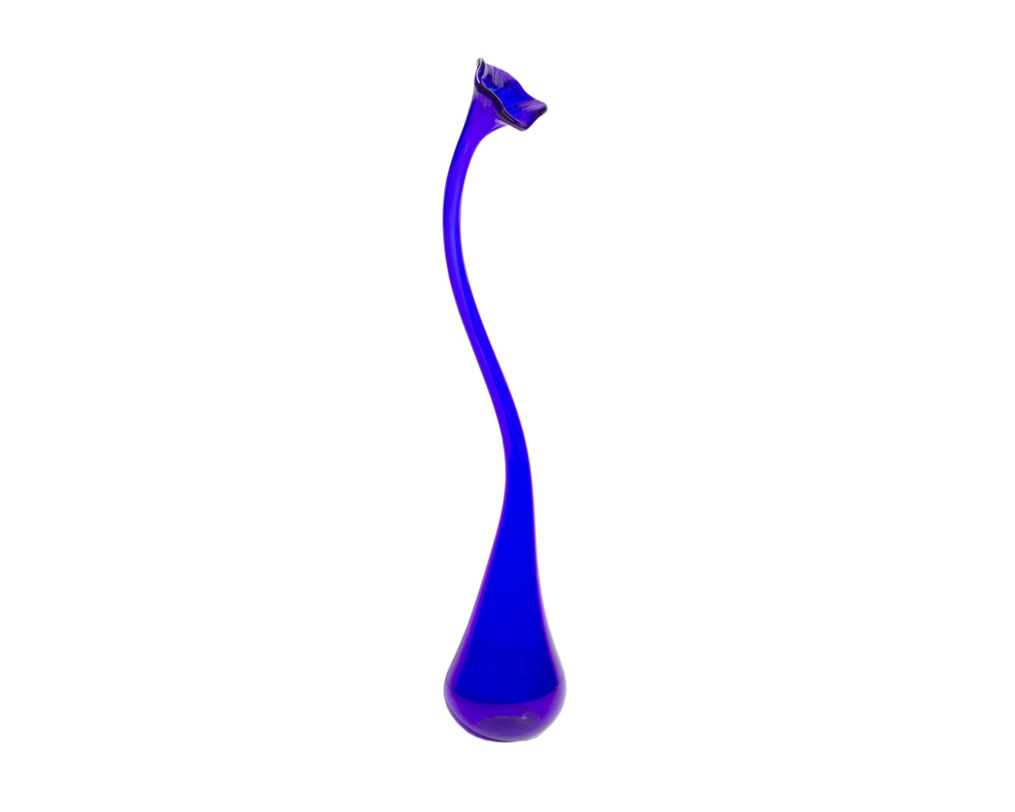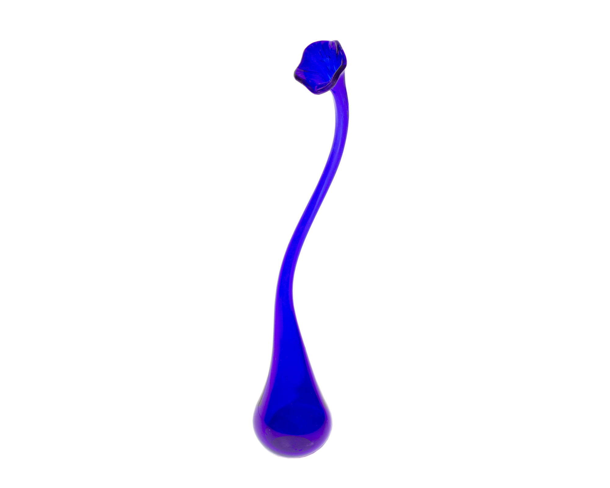 A 2002 art glass by American glass artist Bob Rynearson of Ryno Glass. This vase is made from a cobalt blue glass and features a tall and slender neck with teardrop shaped base. The vase is signed “Ryno Glass 2002” to the bottom edge.