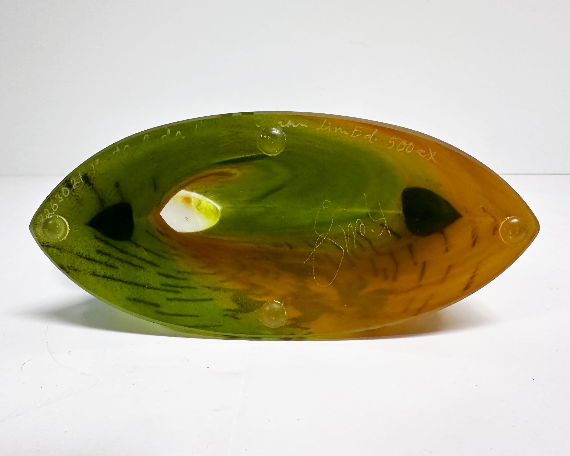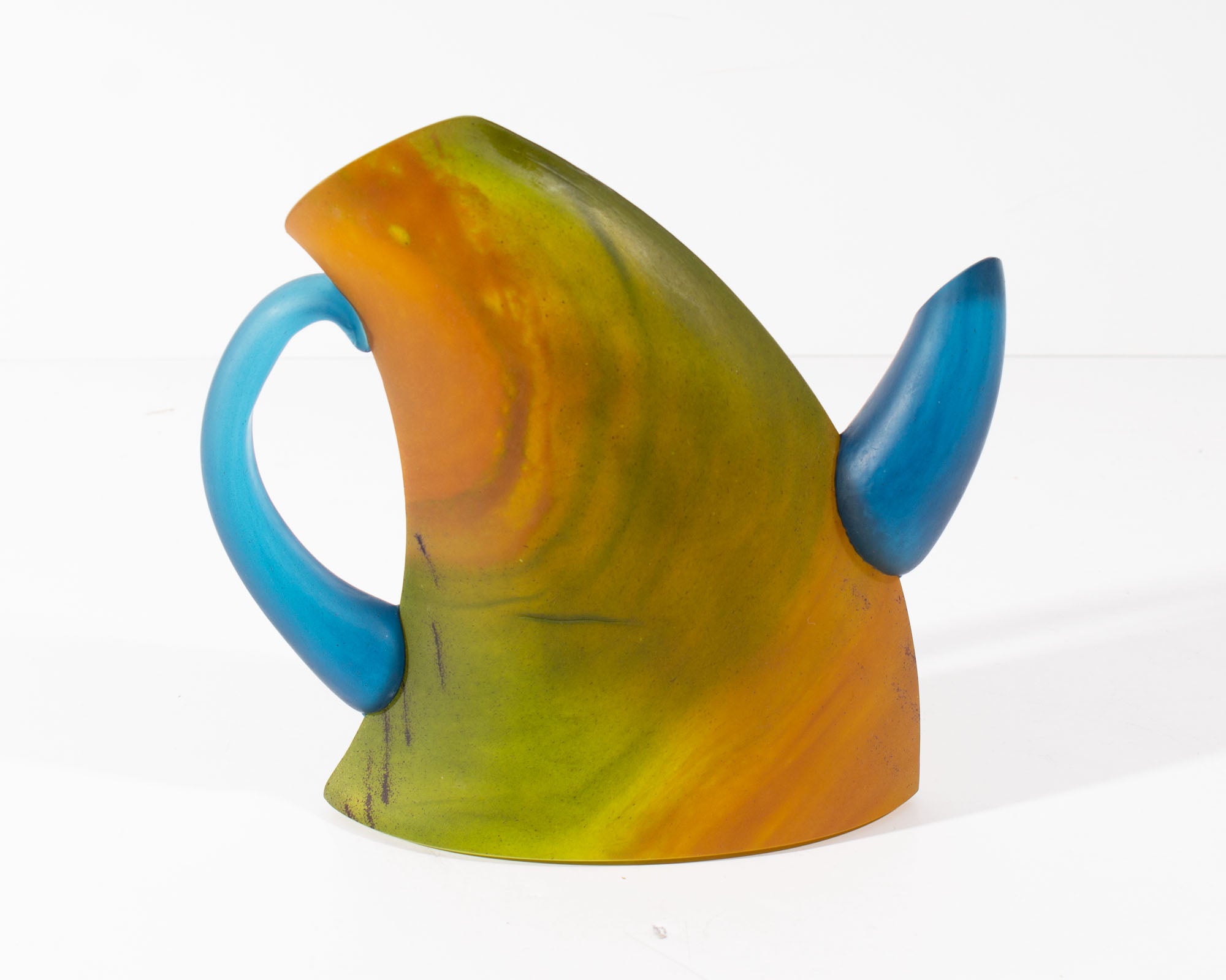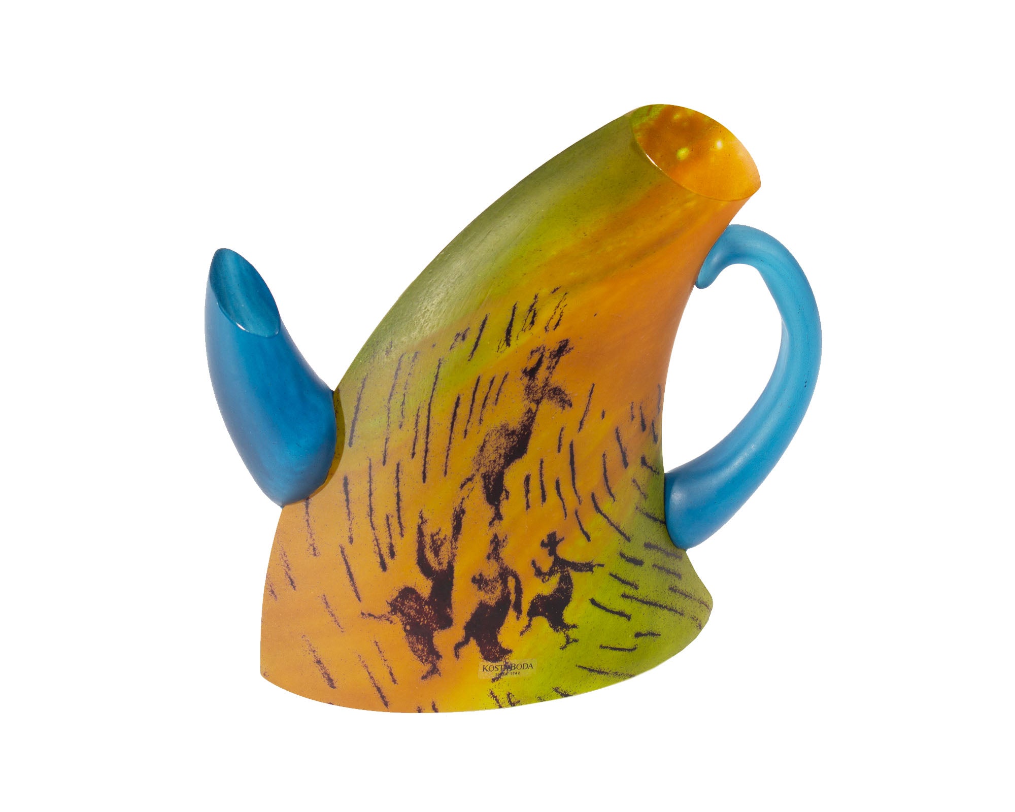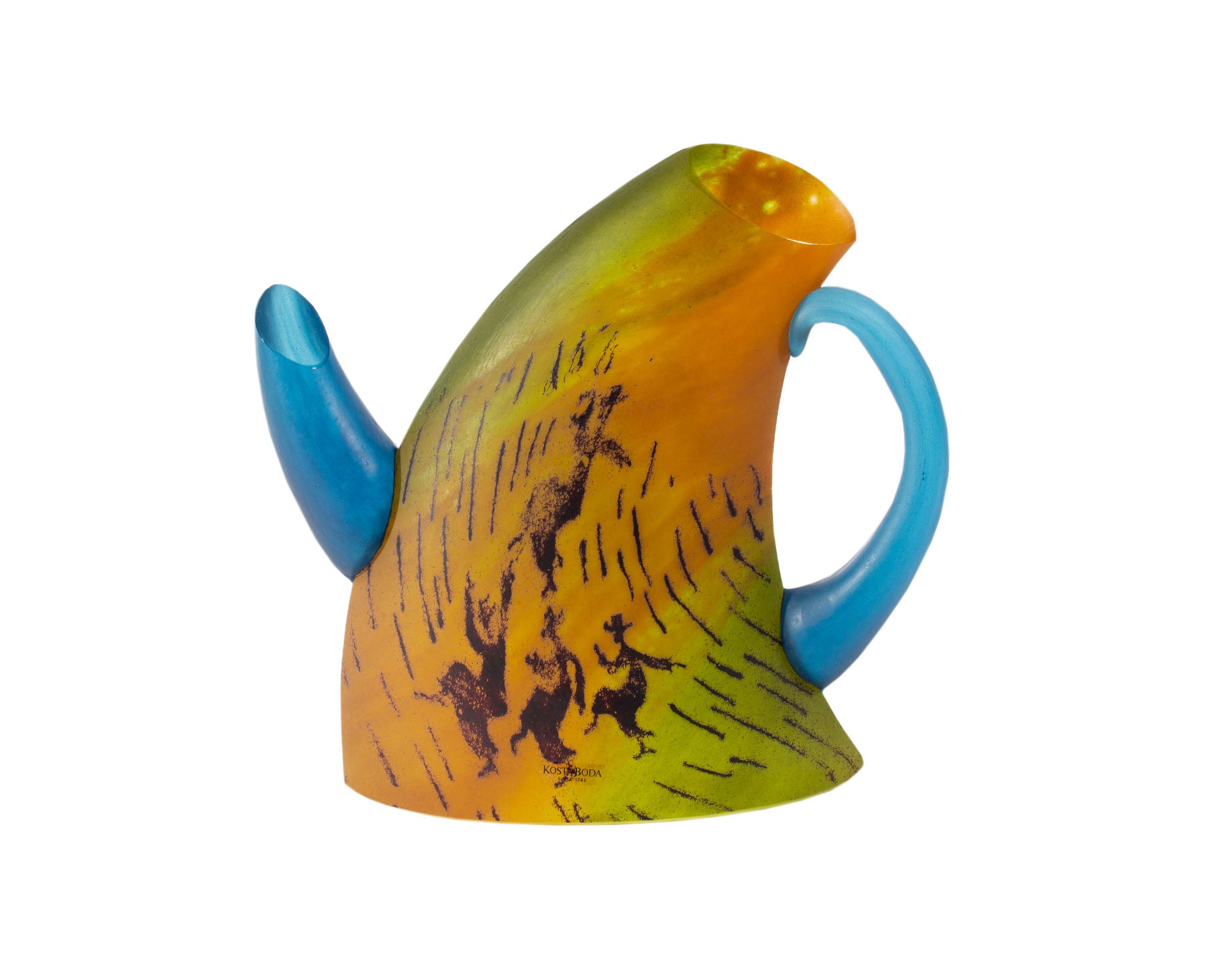 A limited edition teapot sculpture designed by the Swedish artist and designer Kjell Engman (born 1946) and produced by Kosta Boda. This whimsical teapot has a curved form with blue spout and handle. Images of dancing figures are depicted on the front of the green, orange, and yellow body of the teapot. Marked with Kosta Boda sticker near the lower edge, the sculpture is marked "7263021 Kosta Boda Kjell Engman Lim. Ed. 500 ex” to the underside as well as appearing to be signed by Engman at the center of the underside.